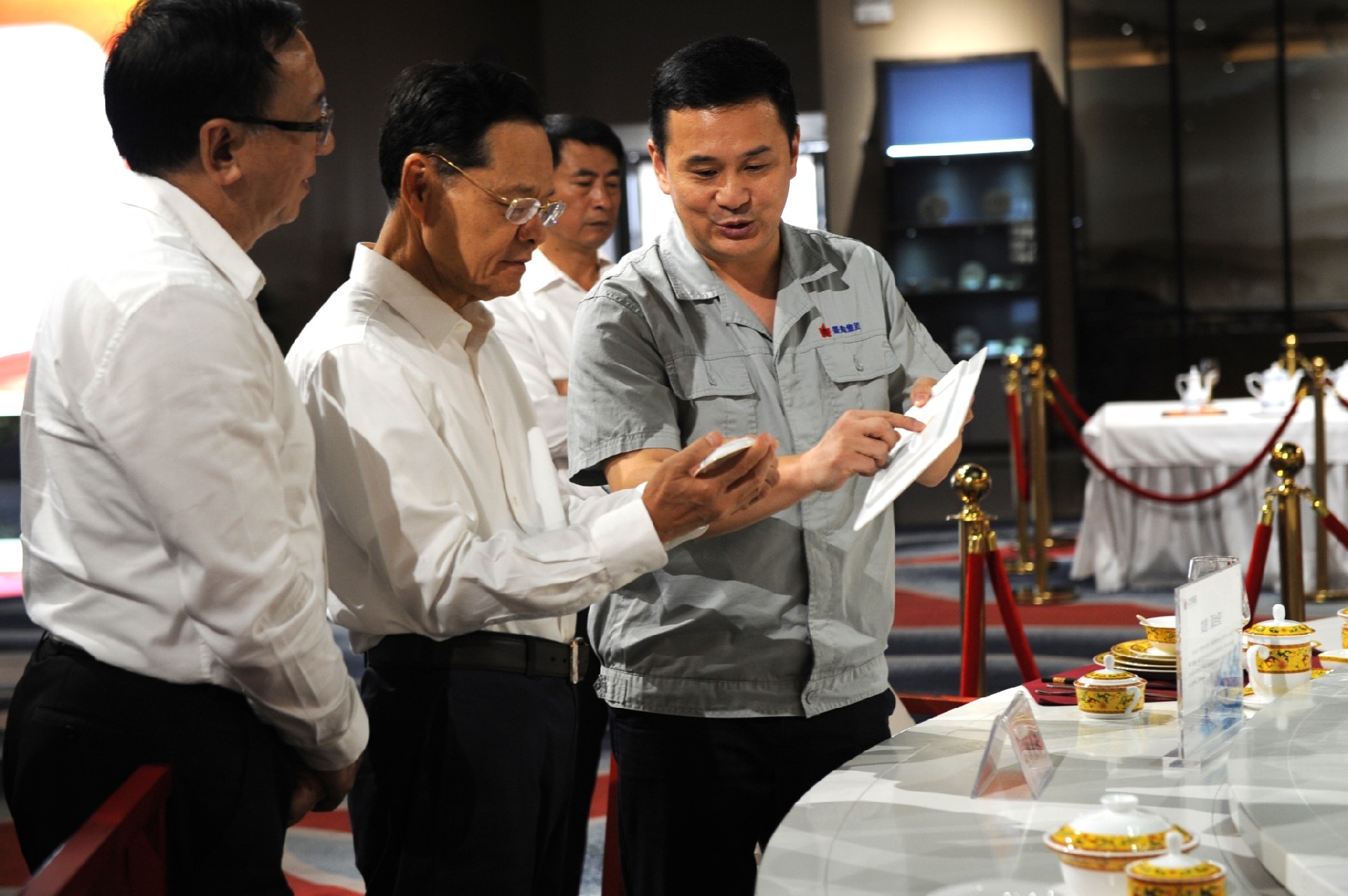 在國瓷館展廳,鄧景揚向陳武介紹了紅葉陶瓷產(chǎn)品特色和先進制瓷工藝,重點講述了一系列“國瓷”“國禮”故事。陳武對精美的產(chǎn)品給予高度評價。